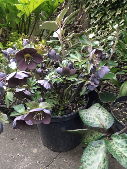 Black-purple flowers with a bluish bloom (could be described as slate-coloured) Dec-Apr. dark foliage, 40cm. Easy, reliable and very long-lived. The overall shape and dissection of the foliage is distinctive and resembles H.foetidus so maybe that's an ancestor.