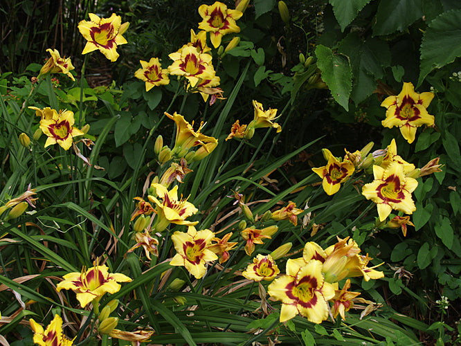 Very good mustard-yellow flowers with a plum-purple eye and picotee edge Jul-Aug, 80cm. I am astonished by its clear striking colour in UK conditions and rate this highly although I usually prefer one-coloured flowers (selfs).