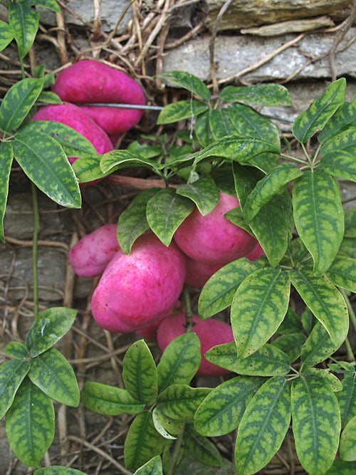 Vigorous hardy evergreen twining climber, bunches of waxy scented greeny cream flowers (female) purple (male) Apr-Jun, fat twinned purple fruits autumn the taste and texture of cold tapioca pudding, 5m.