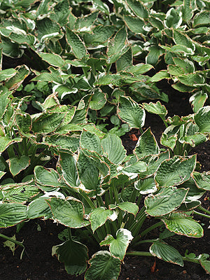 The foliage has a broad white edge which (if defended against molluscs) will light dark places and burns away in light, 25cm.