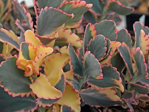 Turquoise-grey, pink and cream serrated fleshy foliage - quite delightful, clusters of bell-shaped orange-red flowers from pink calyces, 30cm. Synonym Bryophyllum fedtschenkoi 'Variegata'. Madagascar. Rainbow kalanchoe.