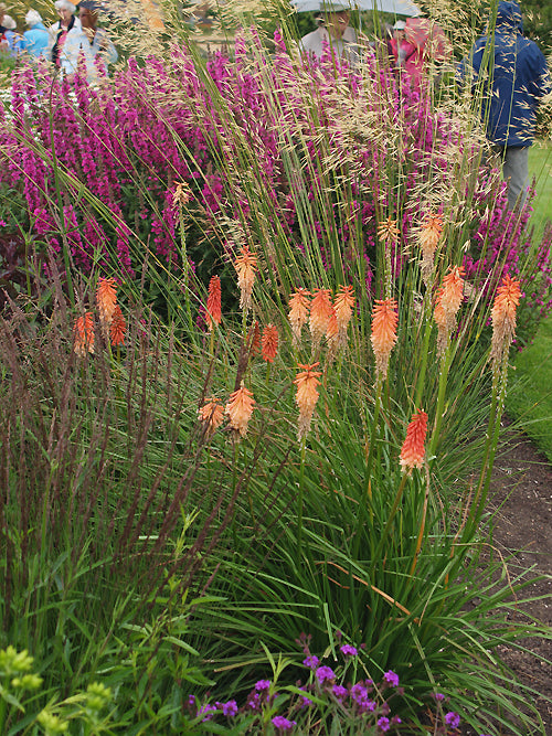 Slender pale soft red and cream pokers Jul-Sep, 70cm. More or less herbaceous and accordingly avoid overcrowding. Not hot dry places nor solid damp clay.