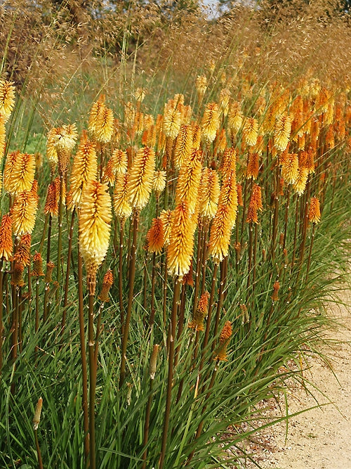Kniphofia 'Tawny King' is an exceptional red hot poker variety, prized for its tawny apricot buds that open to soft cream flowers atop striking dark bronze stems. Blooming from July to October, this vigorous and easy to grow perennial reaches 1.2m tall, making it a standout feature in borders and wildlife gardens.