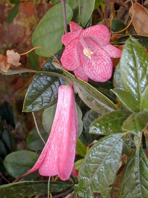 Ex Chilean clones JCA 6.660.120. Large waxy pink flowers in late autumn Oct-Jan, evergreen climber needing the protection of a warm wall and shade.