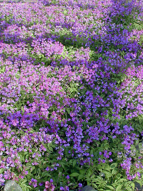 Clusters of blue and/or purple pea flowers in spring Mar-Jun, bushy plant, 45cm. Easy. Good dry shade plant. Everyone should have this.