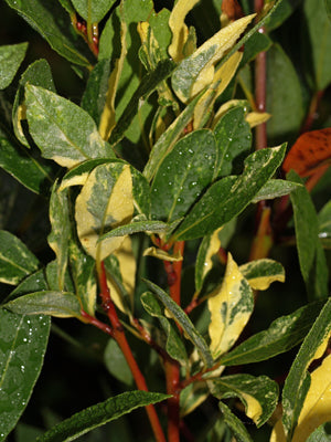 (Sweet bay). Dark green bay leaves with creamy-yellow sectoral variegation, shrub 1-3m. or smaller if trimmed. Herb. Nice. Hardy but cut to the ground by -22C.