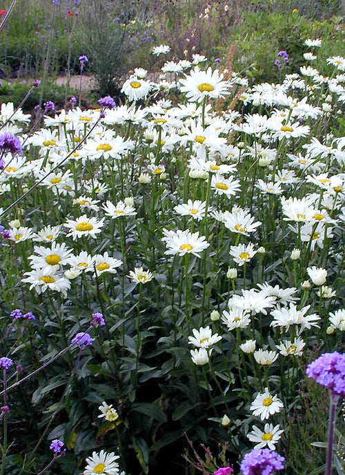 Large pure daisy flowers Jul-Sep, young flowers have a greenish cast, 75cm. Easy, part shade.
