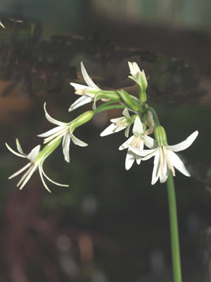 Loose heads of small white flowers with spidery petals Mar-May, 30cm. A collectors bulb. Came as Ancrumia cuspidata.