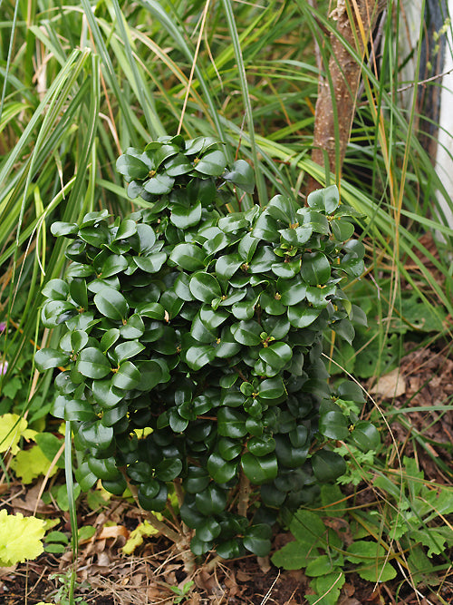 Dense dark glossy evergreen with rounded leathery foliage. 1.5m slowly but looks better kept under 75cm high.