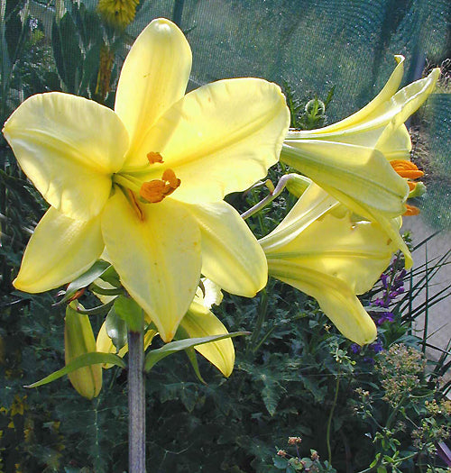 Large highly scented pale orange-yellow trumpet flowers,1-2m. Lime-tolerant, part shade, good soil, easy.