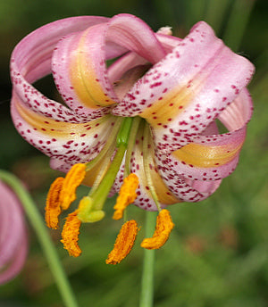 Wide pendent scented turkscap-like flowers, soft pink with purple spots, Jun-Jul. Seed collected 500 feet altitude, Kneeland, North Coast Ranges, Humboldt Co, CA.