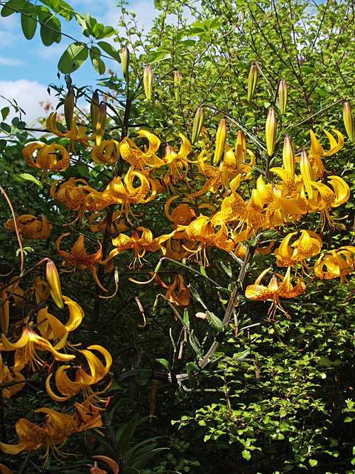 Lilium leitchlinii 'Iwashimizu' is a lovely addition to any garden, featuring upright stems bearing around seven pure deep greeny-yellow turkscap flowers adorned with maroon spots and brown stamens. This striking lily reaches heights of 1 to 2 metres and is stem rooting, adding a vertical accent to mixed borders or container plantings.