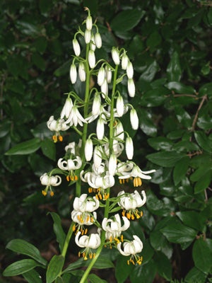 Heads of nodding white turkscap lilies Jun-Jul, 80cm. Needs a summer dry location like dry shade.