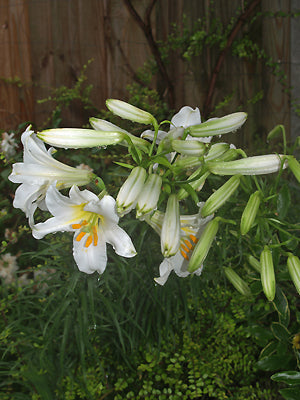 Large scented white trumpet flowers Jun-Jul, 1.3m eventually. Easy in good soil in sun.