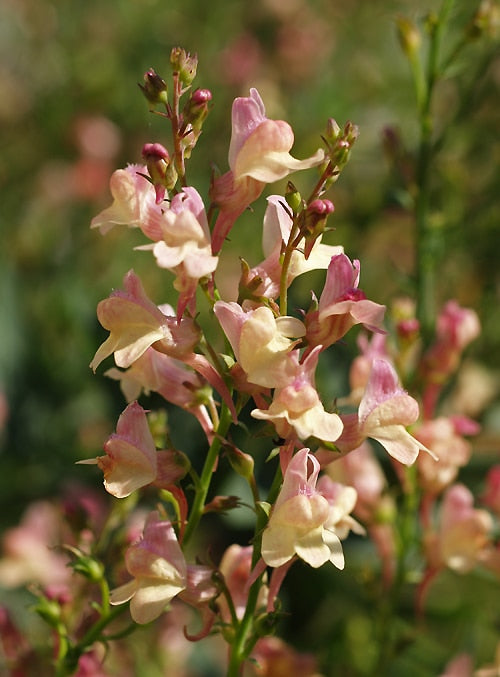 Near sterile hybrid. Spikes of grey-pink buds open creamy yellow snapdragon-like flowers with pink highlights (apricot is a good summary) May-Sep (and later), grey-green foliage, 1m. (?L.purpurea x L.dalmatica).
