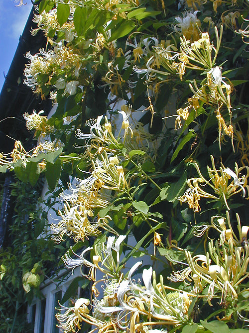 Abundant narrow evening and night-scented cream flowers fade creamy-yellow Jun-Aug and into Dec, nice neat foliage, vigorous evergreen climber, 5m.