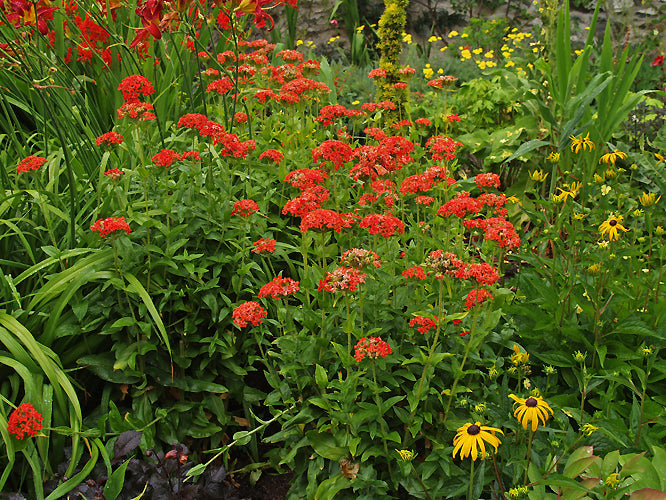 Thin heads of scarlet flowers Jun-Jul, 80cm.