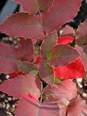 Heads of yellow flowers Mar-May, dusky red evergreen pinnate foliage in summer, autumn and winter, 75cm. Dwarf Oregon grape. Very tough. This came as M.nervosa but apparently wrongly named.
