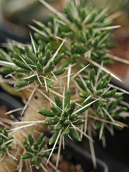 HARDY cactus for well drained dry locations like unwatered in a cold greenhouse. Cylindrical leaves and white spines, large soft lemon-yellow flowers. Seed collected 1300m altitude, Nuble, Argentina.