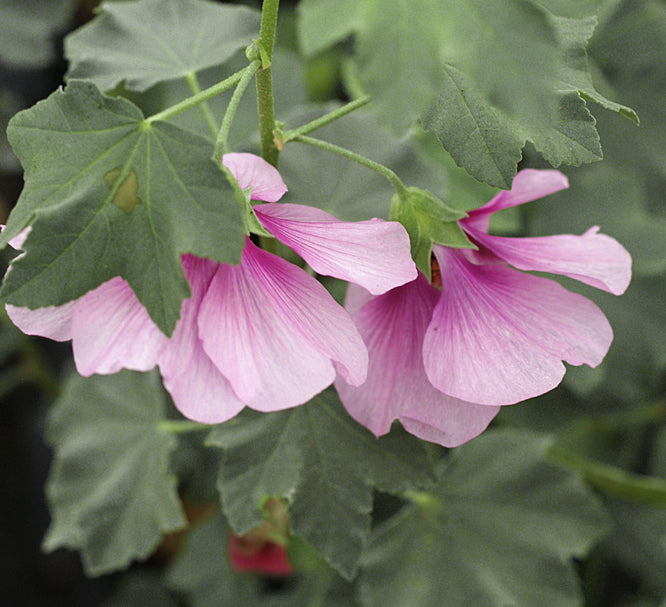 Maroon centred bluish flowers with green sepals visible for most of the year, 2m. Hot dry stony places. Not good - yellowing leaves throughout season jar with flowers and not floriferous. Synonym Lavatera maritima.