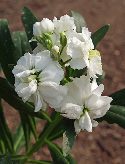 "All the year round" stock - a heritage plant. Scented possibly white double flowers Apr-Jul(Nov) smooth green leaves, 60cm.