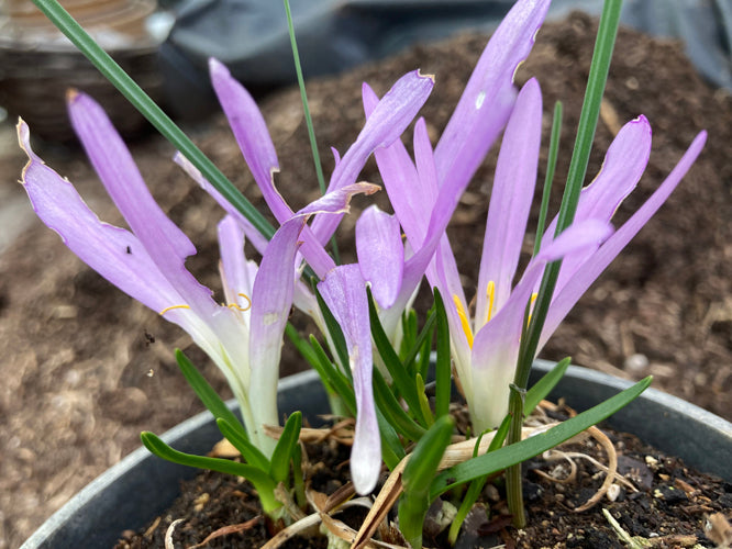 Large pink flowers like tattered crocus autumn-winter, Oct-Jan, 10cm. Selected from the wild (Pyrenees) by Mr.Barrett in the 1950's. Stoloniferous. Synonym Colchicum montanum.