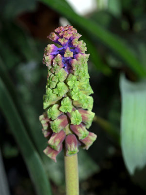 Green-tipped purple flowers develop from buff buds and close as purple-tipped green flowers! Sterile bright blue-purple top knot flowers May-Jun, wide coiled foliage, 25cm. S.Turkey.