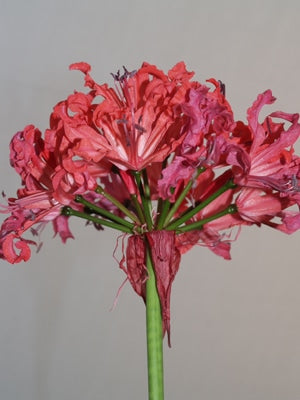 Crinkled deep salmon flowers fade more purple, shiny dark olive-green pedicels Oct-Dec, 65cm.