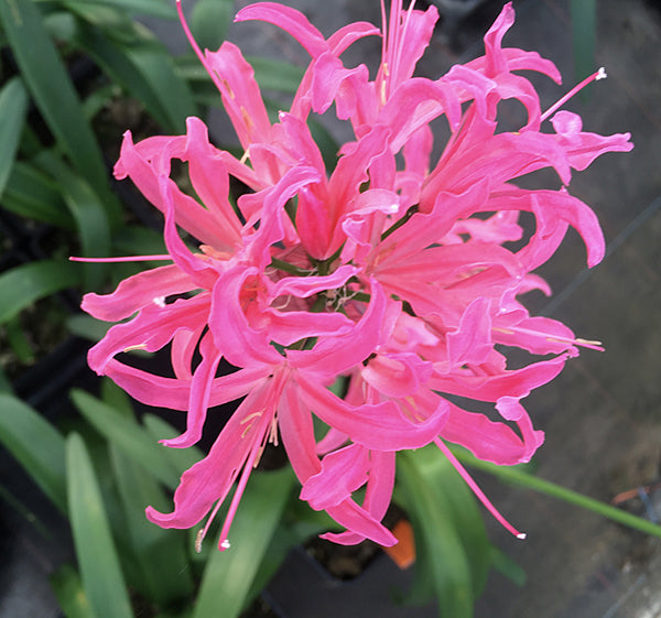 Wavy luminous pink flowers with darker midribs to each tepal Nov-Dec, 50cm.
