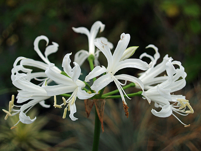 Pure white flowers from very green pedicels Sep-Nov, 50cm.