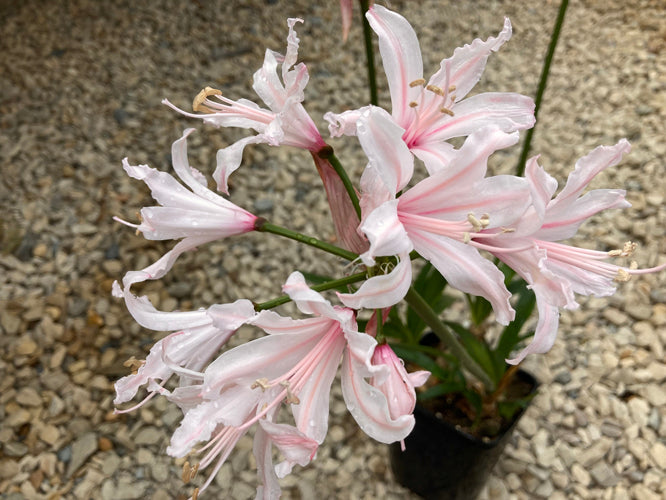 Open heads of large rippled coral-pink and white flowers Oct-Nov, 55cm.