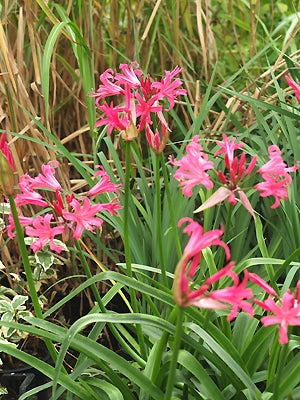 Heads of large fuchsia-red flowers with a sparkling texture Sep-Dec, 65cm. Looks like a N.sarniensis/bowdenii hybrid - in leaf all year. Synonym N.'Kodora'.