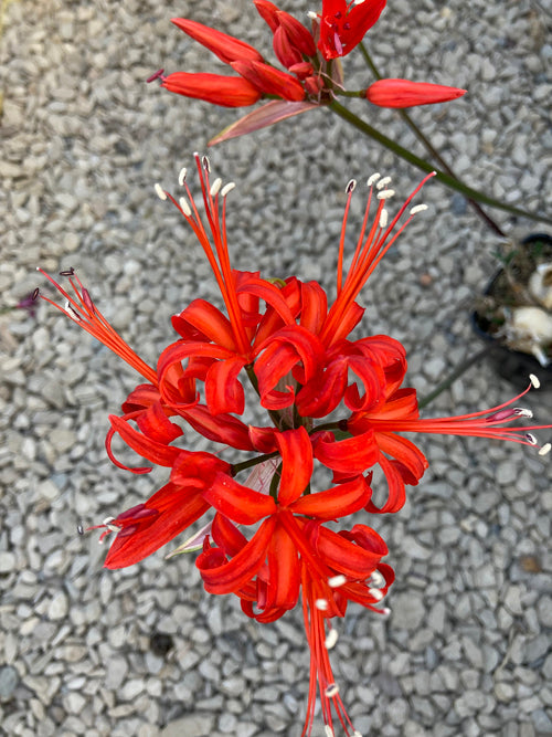 Upfacing heads of stylish bright vermilion flowers with exserted stamens and an orangey midrib Sep-Oct, 50cm.