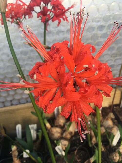 Similar to the species N.sarniensis - tight even spherical heads of slightly rippled vermillion flowers with reflexed tepals and exserted stamens Sep-Oct, 50cm.