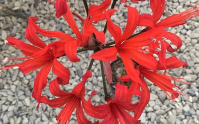Loose heads of wavy vermilion flowers Sep-Oct, 50cm.