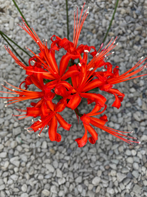 Tight heads of bright vermilion flowers with exserted stamens Oct-Nov, 55cm.