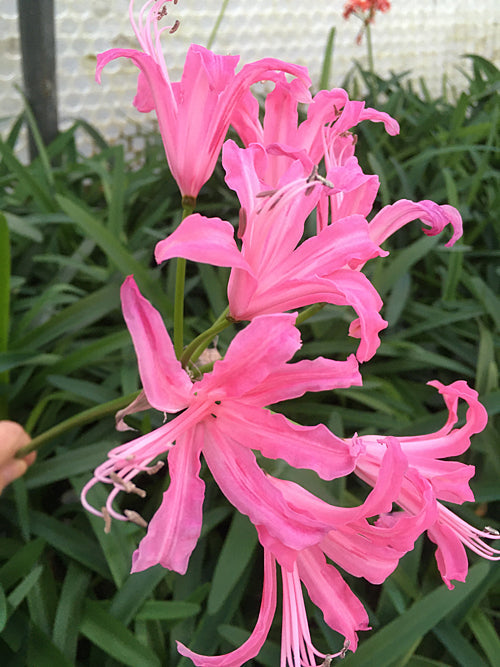 Heads of wavy pink asymetrical flowers with a paler midrib to each tepal and exserted stamens, weak scapes Nov-Dec, 40cm.