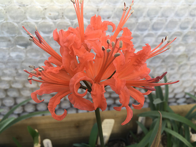 Beautiful sugar frosted pale orange flowers with crinkled reflexed tepals Sep-Oct, 30cm