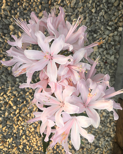 Heads of simple broad-tepalled baby pink flowers with a darker midstripe Oct-Nov, 55cm.