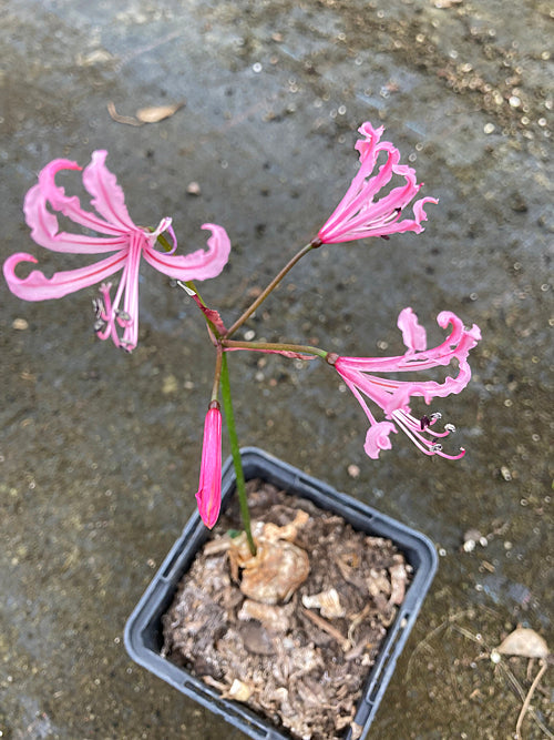 Miniature nerine species, crinkled pink eyelash flower heads from dark khaki spathe and pedicels Sep-Nov, 25cm. Borderline hardy, easy.