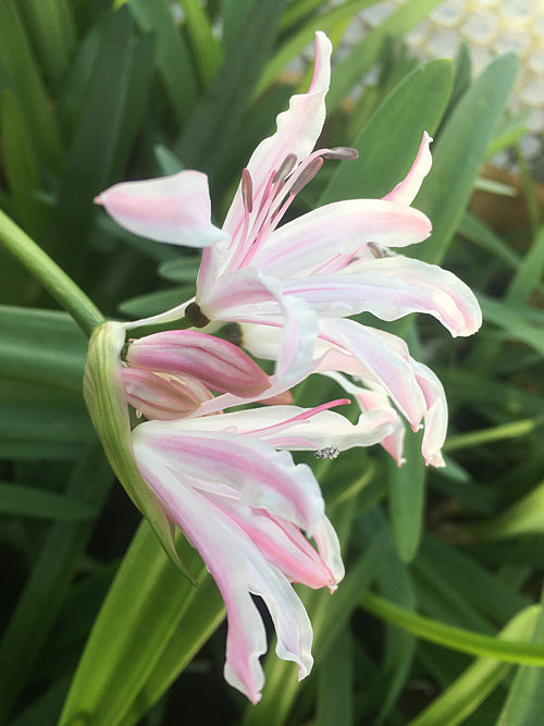 Simple rippled white flowers with pink stripes Nov-Dec, 65cm.