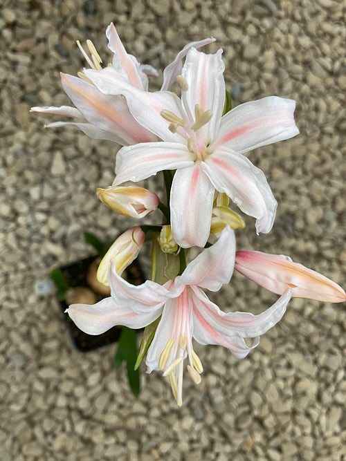 Heads of wavy broad-tepalled white flowers with a coral midstripe, Oct-Nov, 50cm.
