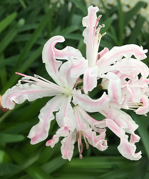 Rippled white flowers with a central pink stripe to each tepal Nov-Dec, 55cm.