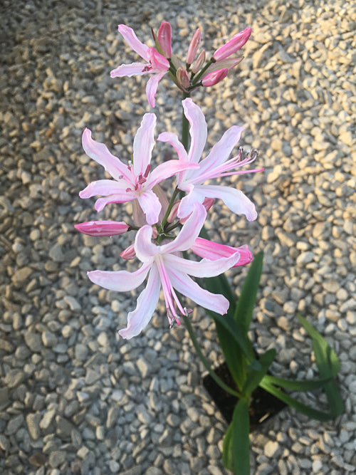 Simple flowers striped with fuchsia pink Oct-Dec, 55cm. Like N.'Judith' but less krinkled.