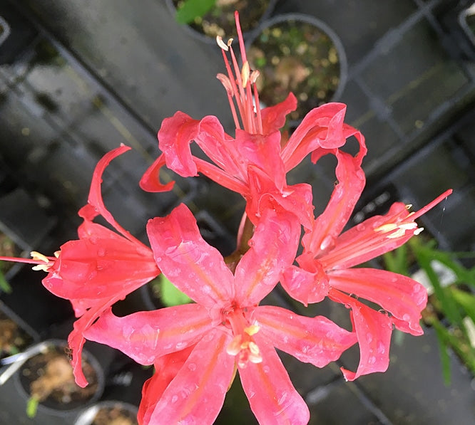 Deep coral-pink flowers with a slight orangey throat Oct-Nov, 60cm
