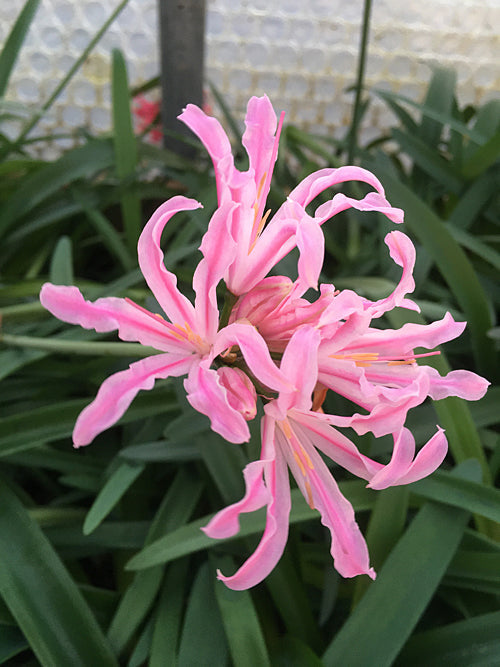 Rippled pale pink flowers with a central deeper pink stripe to each tepal Nov-Dec, 35cm.