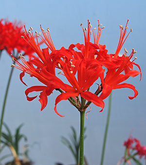 Fiery red flowers look upward in dense umbels Sep-Oct, 50cm. Easy.