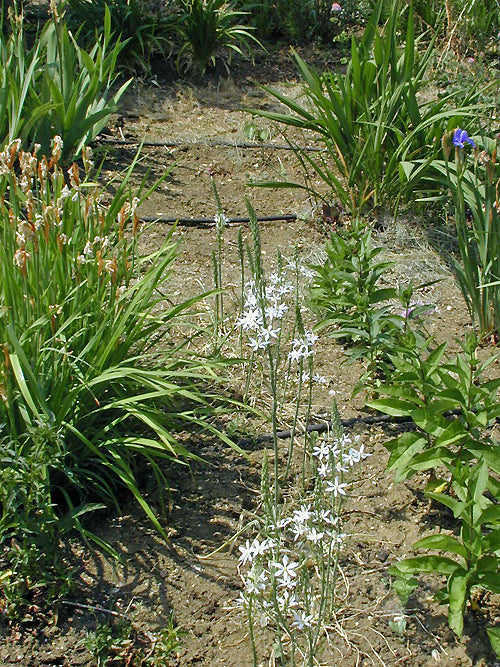 Good for picking. Tall pyramidal heads of white flowers striped green Apr-Jun, 60cm. Easy.