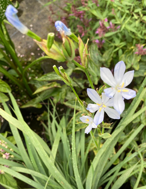 Sky blue flowers held above narrow foliage May-Jun, 50cm.