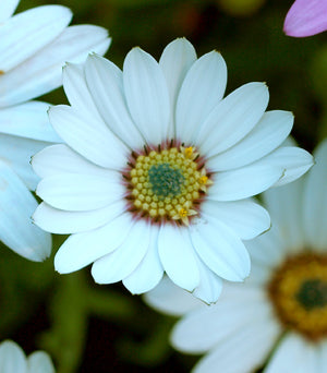 White flowers blue eye Jun-Oct, hardyish, short 20cm. Sun. Hardy.